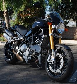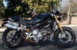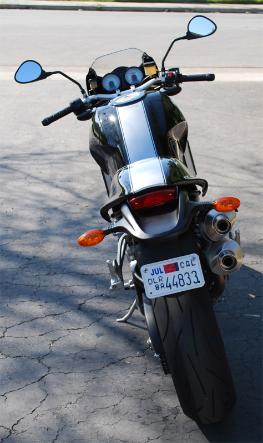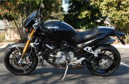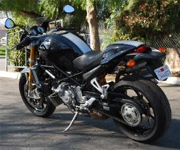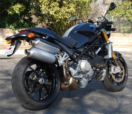 SPECIFICATIONS: Frame: Tubular steel trellis Wheelbase: 1440 mm / 56.7 in Rake & Trail: 24° / NA Front Suspension: Öhlins 43 mm inverted fully adjustable fork with TiN surface treatment Front Wheel Travel: 130 mm / 5.1 in Front Brake: 2 x 320 mm discs, 4-piston 4-pad radial caliper Front Wheel: 5-spoke light alloy 3.50 x 17 Front Tire: 120/70 ZR 17 Rear Suspension: Progressive linkage with fully adjustable Öhlins monoshock. Aluminium single-sided swingarm Rear Wheel Travel: 148 mm / 5.8 in Rear Brake: 245 mm disc, 2-piston caliper Rear Wheel: 5-spoke light alloy 5.50 x 17 Rear Tire: 180/55 ZR 17 Fuel Capacity: 13.5 L / 3.6 US gal (includes 3 L / 0.8 US gal reserve) Dry Weight*: 177 kg / 390 lbs Seat Height: 800 mm / 31.5 in Instruments: Electronic panel: speedometer, rev counter, neutral light, oil pressure warning light, low fuel warning light, high beam indicator, turn signals, immobilizer system, LCD clock and oil temperature, LCD odometer and trip meter Warranty: 2 years unlimited mileage Color combinations (Tank-Frame-Wheels): (red with white stripe-red-black) (pearl white with red stripe-red-white) (black with grey stripe-matte black-black) Versions: Dual seat