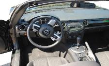STANDARD MX-5 MIATA INTERIOR FEATURES: Dual front air bags* with passenger-side deactivation switch. Side-impact air bags. 3-point lap/shoulder safety belts with pretensioners. Reclining bucket seats with integrated headrests; driver’s. seatback storage pocket. Black cloth upholstery and carpet floor mats. Rear open storage compartments (behind seats). Lockable rear center console storage and glove compartment. Door- mounted bottle holders. Dual cup holders with covers. Power windows with driver’s one-touch-down feature. Remote trunk-lid and fuel-door release. Courtesy light on windshield header; ignition-keyhole light. White-on-black gauges with red nighttime illumination. Full instrumentation, including tachometer, coolant-temperature, and oil-pressure gauges. 3-spoke leather- wrapped tilt steering wheel heater/defroster with multi-speed blower and side- window demisters. CFC-free air conditioning. AM/FM/CD stereo with 4 speakers and digital clock. Engine-immobilizer anti-theft system