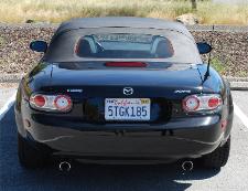 STANDARD MX-5 MIATA EXTERIOR FEATURES: 16-inch 5-spoke alloy wheels P205/50R16 high-performance radial tires. Lightweight aluminum hood and trunk lid. Black vinyl Z-fold convertible top with central release latch. Black seatback bars and aero mesh screen. Glass rear window with defogger. Dual body-color power remote mirrors. 2-speed intermittent windshield wipers. Rear fender-mounted antenna. Clear-lens halogen headlights with projector- type low beams.